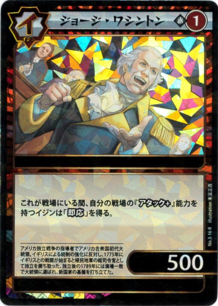 3-16 ジョージ・ワシントン 2024.07.07 色属性レアリティレベルパワー特性赤イジンR1500ーテキスト これが戦場にいる間、自分の戦場の「アタック+」能力を持つイジンは「即応」を得る。遺業能力ー TIPS ジョージ・ワシントンで即応を得たイジンが攻撃した後、何らかの効果でワシントンが戦場を離れた場合、そのイジンは即応を失うがアタッカーではあり続ける。