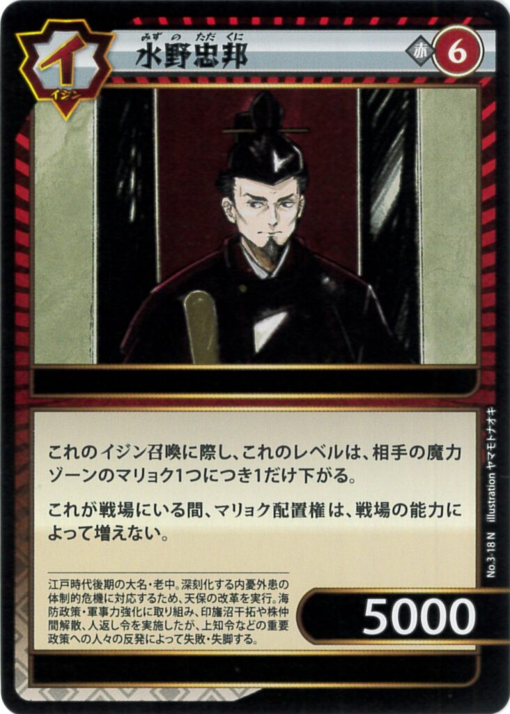 3-18 水野忠邦 2024.07.07 色属性レアリティレベルパワー特性赤イジンN65000ーテキスト これのイジン召喚に際し、これのレベルは、相手の魔力ゾーンのマリョク1つにつき1だけ下がる。これが戦場にいる間、マリョク配置権は、戦場の能力によって増えない。遺業能力ー TIPS 召喚が終わり戦場に出てからはレベル6として扱う。 マホウでマリョク配置権を追加することを防ぐことはできない。