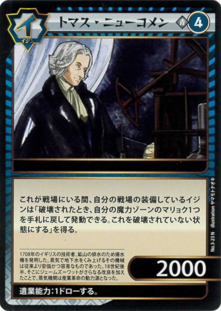 3-23 トマス・ニューコメン 2024.07.07 色属性レアリティレベルパワー特性青イジンN42000ーテキスト これが戦場にいる間、自分の戦場の装備しているイジンは「破壊されたとき、自分の魔力ゾーンのマリョク1つを手札に戻して発動できる。これを破壊されていない状態にする」を得る。遺業能力1ドローする TIPS 魔力ゾーンの裏向きのカードを戻して発動させることはできない。(マリョクとは魔力ゾーンに置かれた表向きのマリョクカードのことを指すため)
