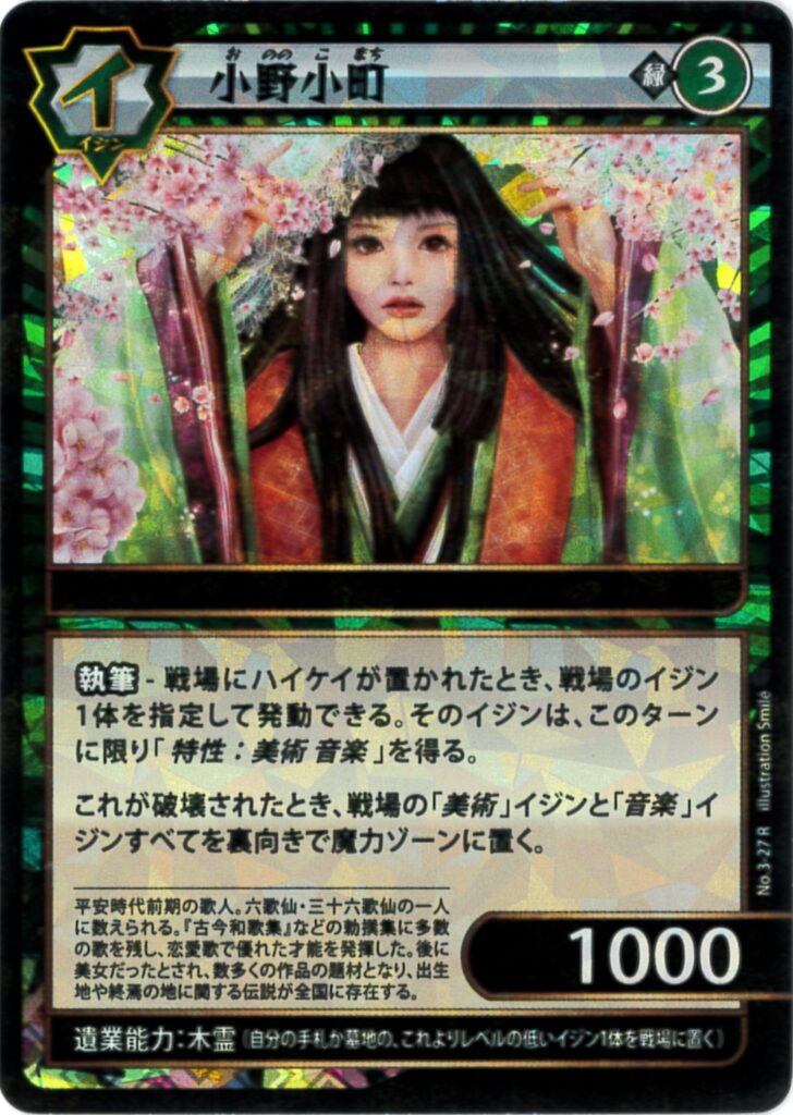 執筆-ハイケイか緑のイジンが戦場に置かれたとき、戦場のイジン1体を指定して発動できる。そのイジンは、このターンに限り「特性:美術 音楽」を得る。 これが破壊されたとき、戦場の「美術」イジンと「音楽」イジンすべてを裏向きで魔力ゾーンに置く。 | |||||