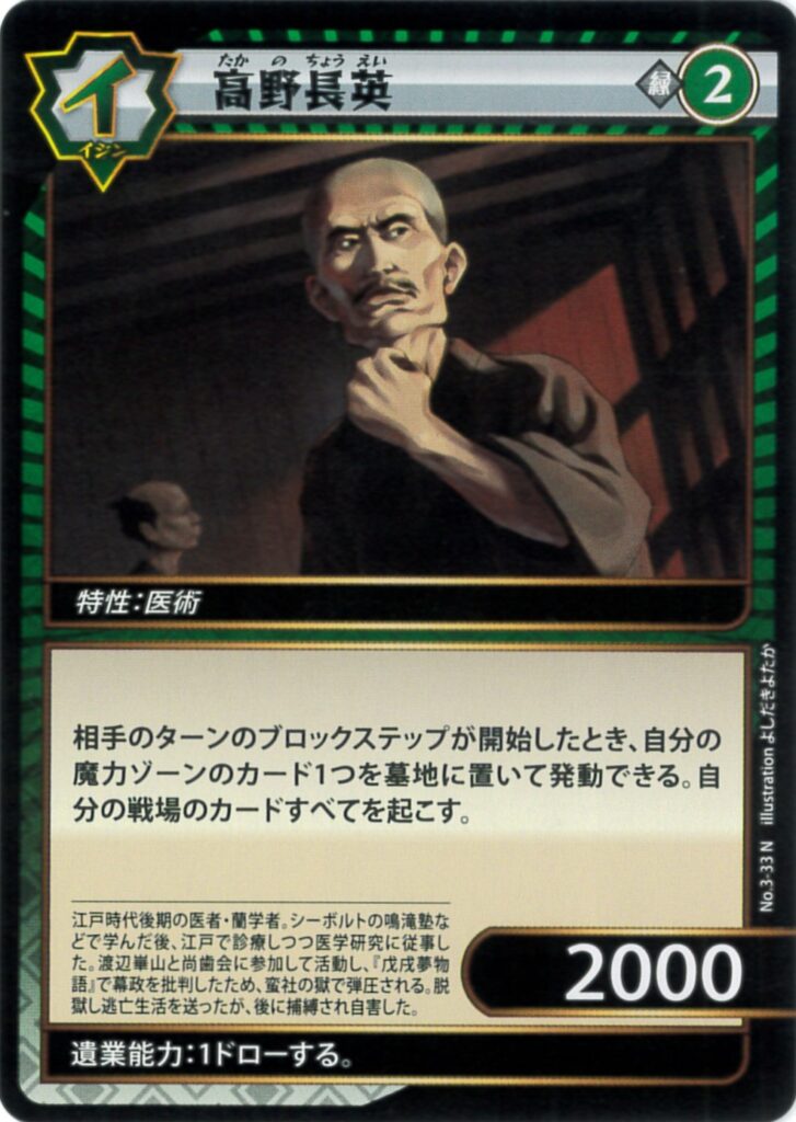 3-33 高野長英 2024.07.07 色属性レアリティレベルパワー特性緑イジンN22000医術テキスト 相手のターンのブロックステップが開始したとき、自分の魔力ゾーンのカード1つを墓地に置いて発動できる。自分の戦場のカードすべてを起こす。遺業能力1ドローする TIPS ブロッカーを選ぶ前に発動できる。起こしたカードでブロックすることもできる。