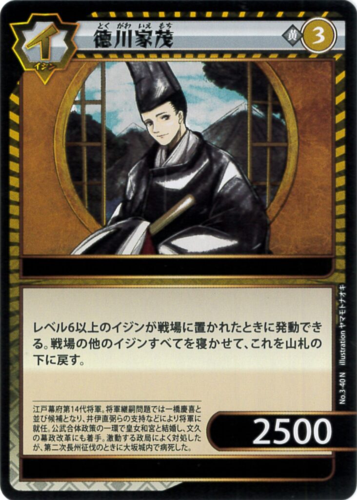 3-40 徳川家茂 2024.07.07 色属性レアリティレベルパワー特性黄イジンN32500ーテキスト レベル6以上のイジンが戦場に置かれたときに発動できる。戦場の他のイジンすべてを寝かせて、これを山札の下に戻す。遺業能力ー TIPS 相手の戦場にレベル6以上のイジンがでたときも発動できる。 相手の戦場のイジン、自分の戦場のイジンを全て寝かせる。