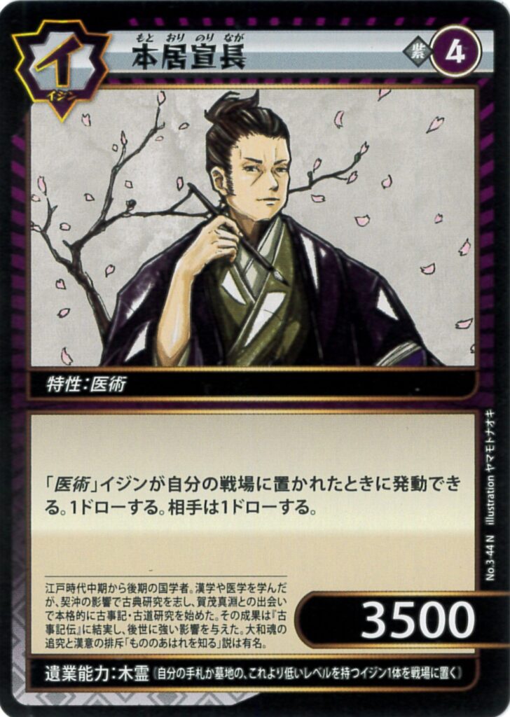 3-44 本居宣長 2024.07.07 色属性レアリティレベルパワー特性紫イジンN43500医術テキスト 「医術」イジンが自分の戦場に置かれたときに発動できる。1ドローする。相手は1ドローする。遺業能力木霊(自分の手札か墓地の、これより低いレベルを持つイジン1体を戦場に置く) TIPS 本居宣長自身が戦場に置かれたときもお互いに1枚ずつ引くことができる。