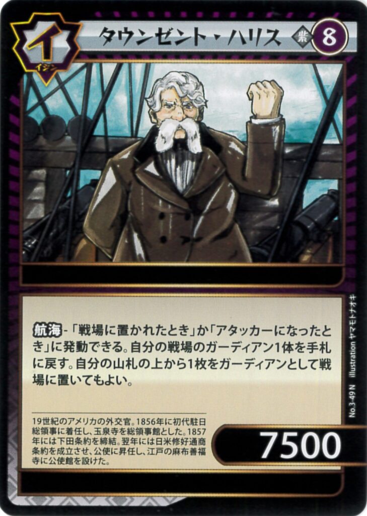 3-49 タウンゼント・ハリス 2024.07.07 色属性レアリティレベルパワー特性紫イジンN87500ーテキスト 航海-「戦場に置かれたとき」か「アタッカーになったとき」に発動できる。自分の戦場のガーディアン1体を手札に戻す。自分の山札の上から1枚をガーディアンとして戦場に置いてもよい。遺業能力ー TIPS 手札に戻したカードを確認してから、ガーディアンとして置くカードを選ぶことができる。