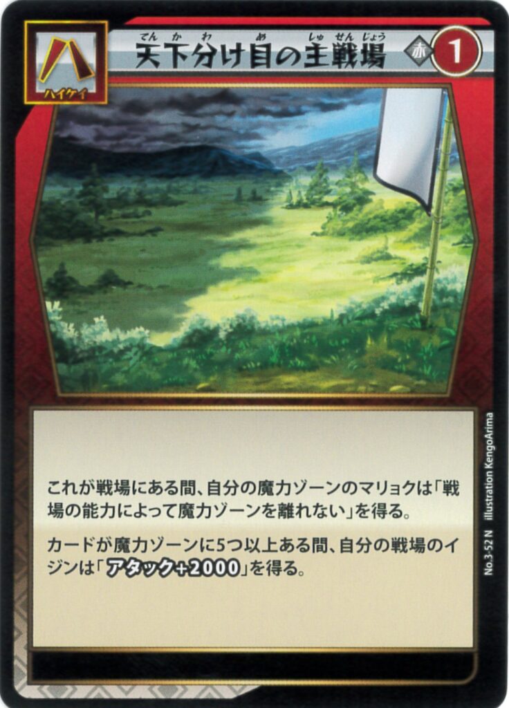 3-52 天下分け目の主戦場 2024.07.07 色属性レアリティレベルパワー特性赤ハイケイN1ーーテキスト これが戦場にある間、自分の魔力ゾーンのマリョクは「戦場の能力によって魔力ゾーンを離れない」を得る。カードが魔力ゾーンに5つ以上ある間、自分の戦場のイジンは「アタック+2000」を得る。遺業能力ー TIPS マホウや、マホウコスト、魔力ゾーンからの装備では魔力ゾーンを離れる。(戦場の能力ではないため) 相手の魔力ゾーンと合わせて5つ以上で発動する。