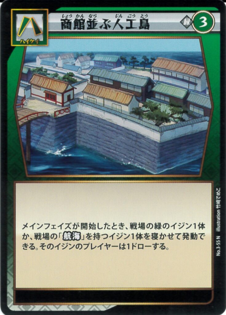 3-55 商館並ぶ人工島 2024.07.07 色属性レアリティレベルパワー特性緑ハイケイN3ーーテキスト メインフェイズが開始したとき、戦場の緑のイジン1体が、戦場の「航海」を持つイジン1体を寝かせて発動できる。そのイジンのプレイヤーは1ドローする。遺業能力ー TIPS 相手のメインフェイズの開始時に発動できる 相手のイジンを寝かせることができるが、その場合は相手がドローする