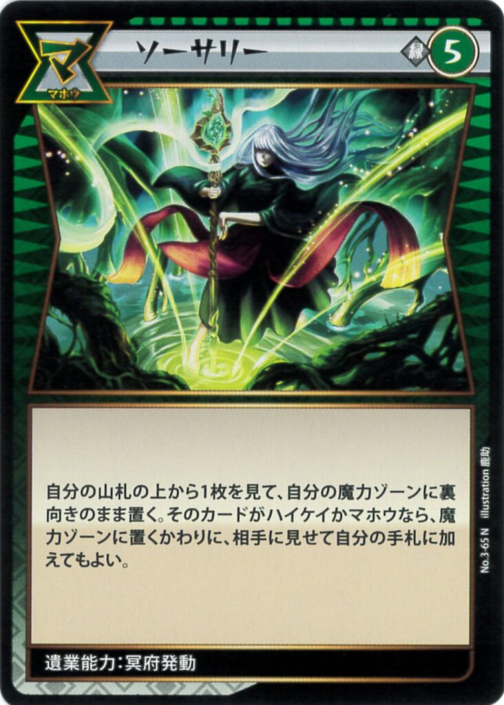3-65 ソーサリー 2024.07.07 色属性レアリティレベルパワー特性緑マホウN5ーーテキスト 自分の山札の上から1枚を見て、自分の魔力ゾーンに裏向きのまま置く。そのカードがハイケイかマホウなら、魔力ゾーンに置く代わりに、相手に見せて自分の手札に加えてもよい。遺業能力冥府発動 TIPS