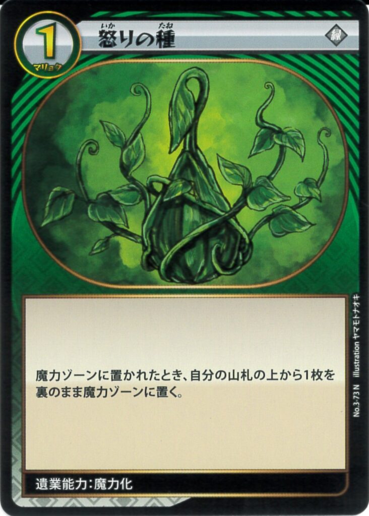 3-73 怒りの種 2024.07.07 色属性レアリティレベルパワー特性緑マリョクN1ーーテキスト 魔力ゾーンに置かれたとき、自分の山札の上から1枚を裏のまま魔力ゾーンに置く。遺業能力魔力化 TIPS