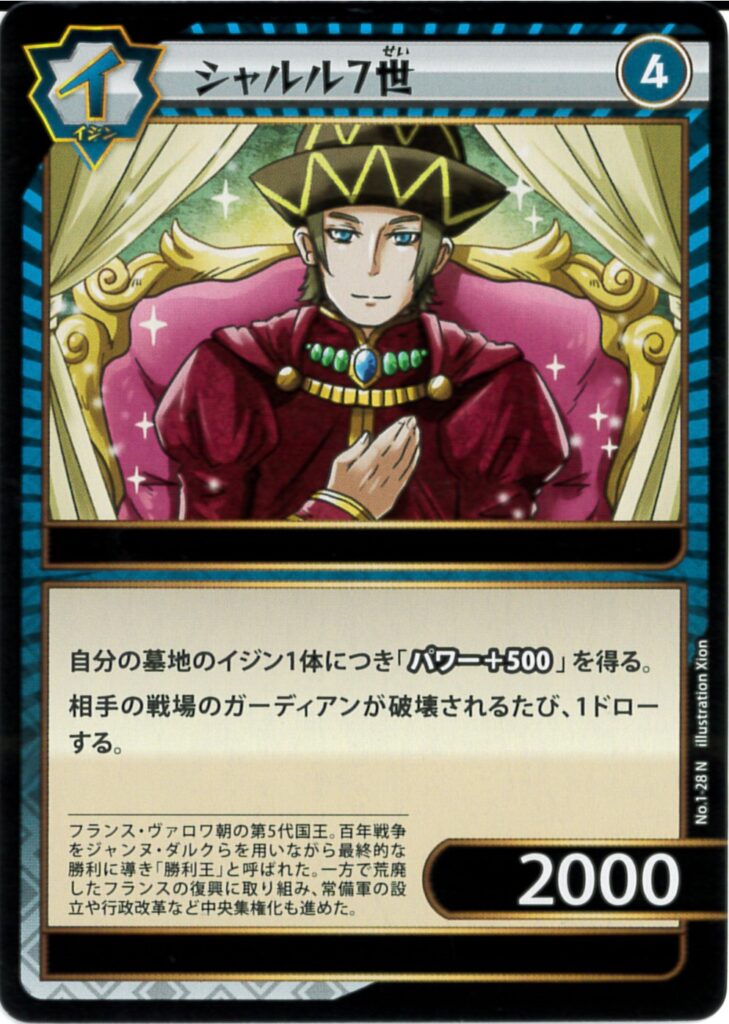1-28 シャルル7世 2023.07.222024.01.31 色属性レアリティレベルパワー特性青イジンN42000ーテキスト 自分の墓地のイジン1体につき「パワー+500」を得る。相手の戦場のガーディアンが破壊されるたび、1ドローする。遺業能力ー TIPS ガーディアンが同時に2体以上破壊された場合は、その数分ドローする。 バレットなどで相手のイジンとシャルル7世が同時に破壊された場合も1枚引くことができる。