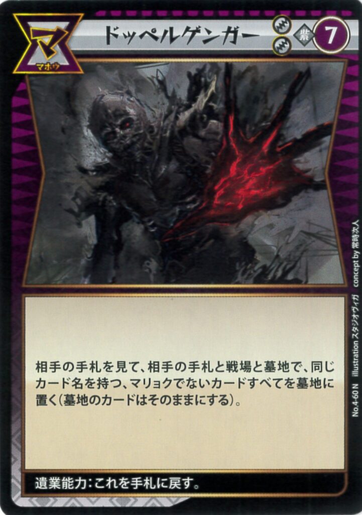4-60 ドッペルゲンガー 2025.01.05 色属性レアリティレベルパワー特性紫マホウN7(コスト2)ーーテキスト 相手の手札を見て、相手の手札と戦場と墓地で、同じカード名を持つ、マリョクでないカードすべてを墓地に置く(墓地のカードはそのままにする)。遺業能力これを手札に戻す TIPS 手札と戦場、墓地と戦場、戦場に複数枚、手札に複数枚など、同盟のものがあればすべて墓地に置かれる。
