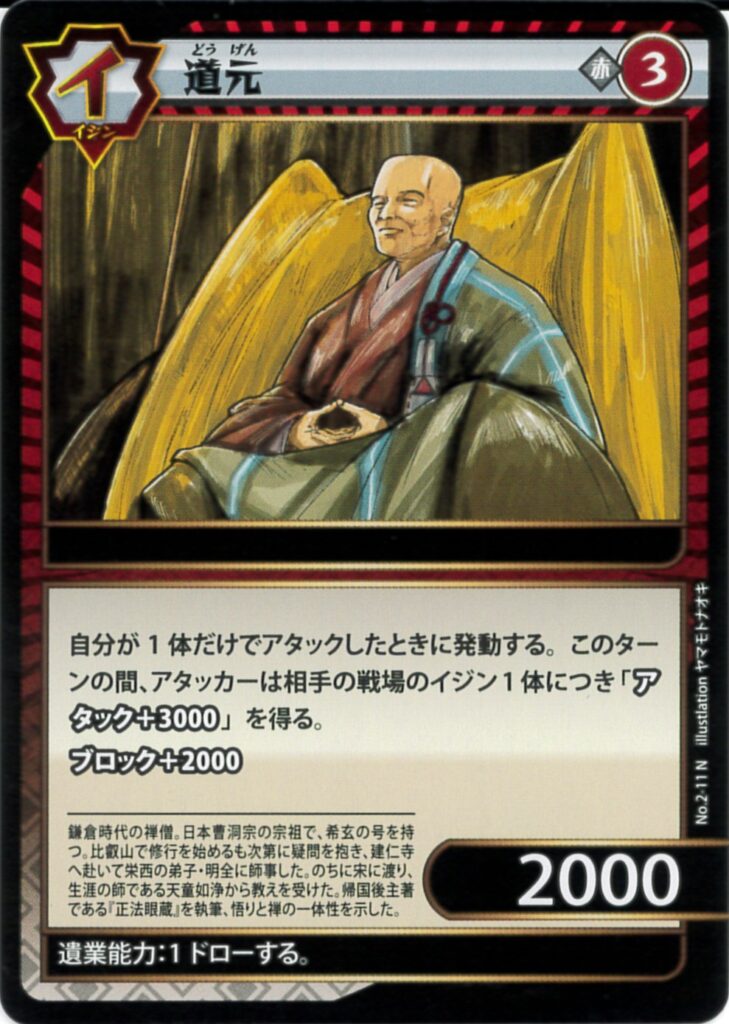 2‐11 道元 2023.12.292024.01.30 色属性レアリティレベルパワー特性赤イジンN32000-テキスト 自分が1体だけでアタックしたときに発動できる。このターンの間、アタッカーは相手の戦場のイジン1体につき「アタック+3000」を得る。ブロック+2000遺業能力1ドローする TIPS 効果が発動すれば必ず相手の戦場のイジン1体につき「アタック+3000」を得なければならない。 栄西がアタックせず、別のイジンが1体だけアタックしたときも発動する。