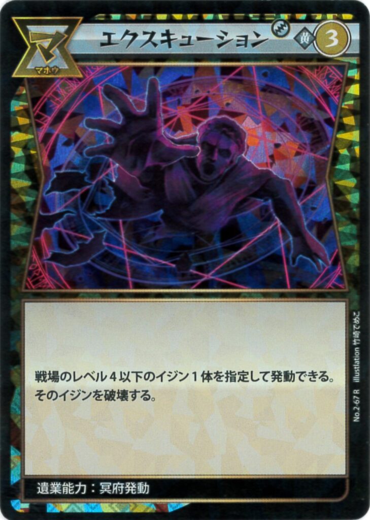 2‐67 エクスキューション 2023.12.292024.01.30 色属性レアリティレベルパワー特性黄マホウR3(コスト1)--テキスト 戦場のレベル4以下のイジン1体を指定して発動できる。そのイジンを破壊する。遺業能力冥府発動 TIPS 自分の戦場のイジンも指定できる。