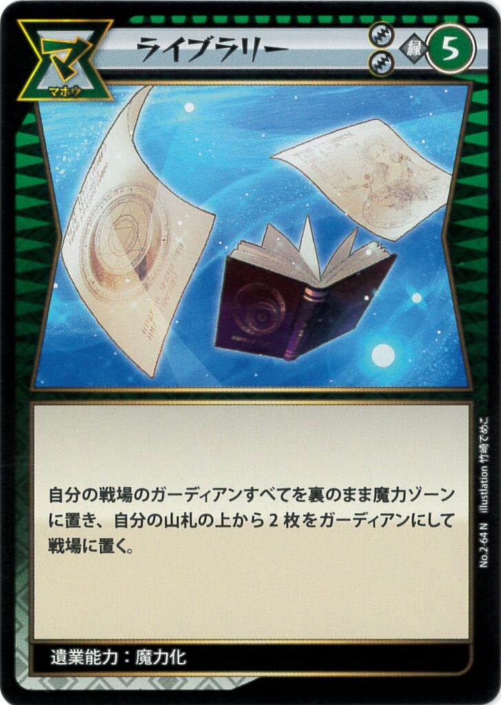 2‐64 ライブラリー 2023.12.292024.01.30 色属性レアリティレベルパワー特性緑マホウN5(コスト2)--テキスト 自分の戦場のガーディアンすべてを裏のまま魔力ゾーンに置き、自分の山札の上から2枚をガーディアンにして戦場に置く。遺業能力魔力化 TIPS 山札が1枚なら1枚をガーディアンとして置く。