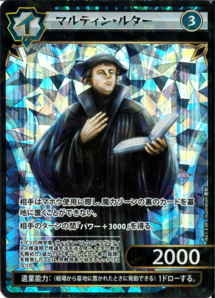 1-3 マルティン・ルター 2023.07.222024.01.31 色属性レアリティレベルパワー特性青イジンSR32000ーテキスト 相手はマホウの使用に際し、魔力ゾーンのカードを墓地に置くことができない。相手のターンの間「パワー+3000」を得る。遺業能力1ドローする TIPS この効果により相手は魔力コストの支払いの必要があるマホウは使用できなくなる。 「千利休」などで魔力コストそのものを減らすことができれば、ルターの効果をかわして魔力コストの必要なマホウを使用できる。