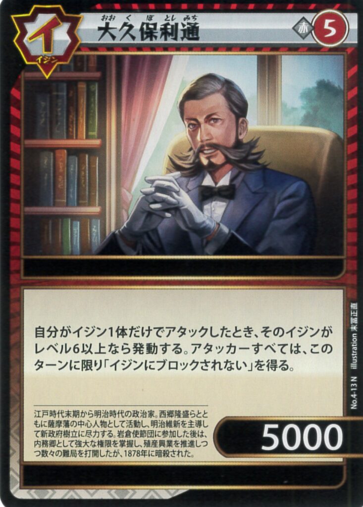 4-13 大久保利通 2025.01.02 色属性レアリティレベルパワー特性赤イジンN5 5000ーテキスト 自分がイジン1体だけでアタックしたとき、そのイジンがレベル6以上なら発動する。アタッカーすべては、このターンに限り「イジンにブロックされない」を得る。遺業能力ー TIPS 例えば西郷隆盛と合わせるとイジンにブロックされないモータル持ちができるので強い。
