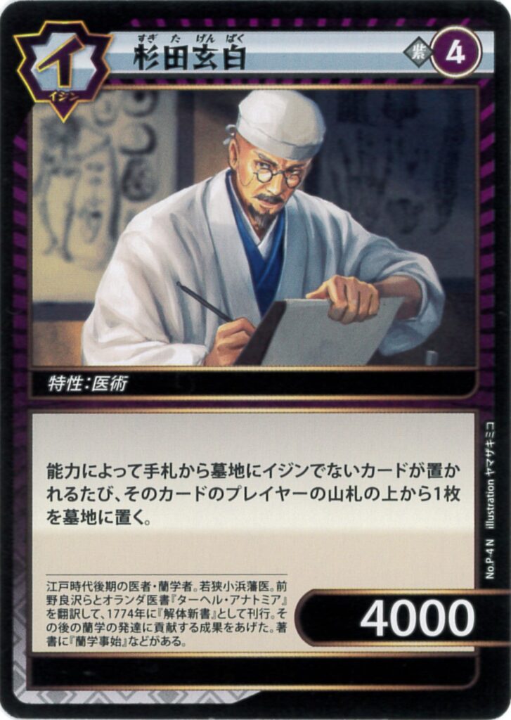 P-4 杉田玄白 2024.07.07 色属性レアリティレベルパワー特性紫イジンN44000ーテキスト 能力によって手札から墓地にイジンでないカードが置かれるたび、そのカードのプレイヤーの山札の上から1枚を墓地に置く。遺業能力ー TIPS