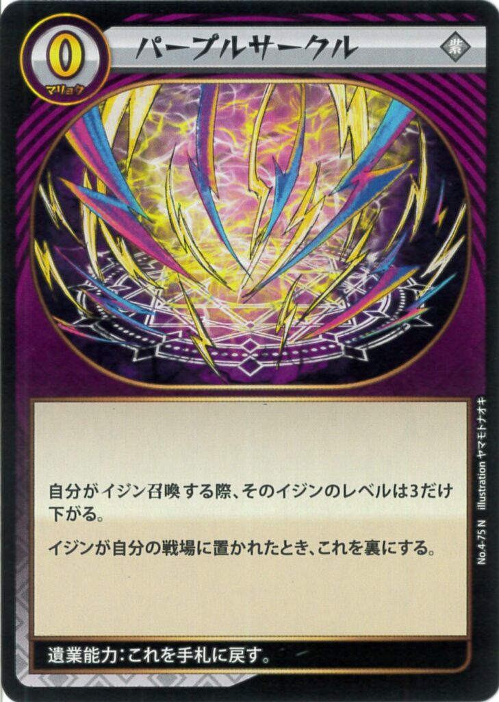 4-75 パープルサークル 2025.01.04 色属性レアリティレベルパワー特性紫マリョクN0ーーテキスト 自分がイジン召喚する際、そのイジンのレベルは3だけ下がる。 イジンが自分の戦場に置かれたとき、これを裏にする。遺業能力これを手札に戻す TIPS イジン召喚以外の方法で戦場にイジンが出た場合でも裏にする。