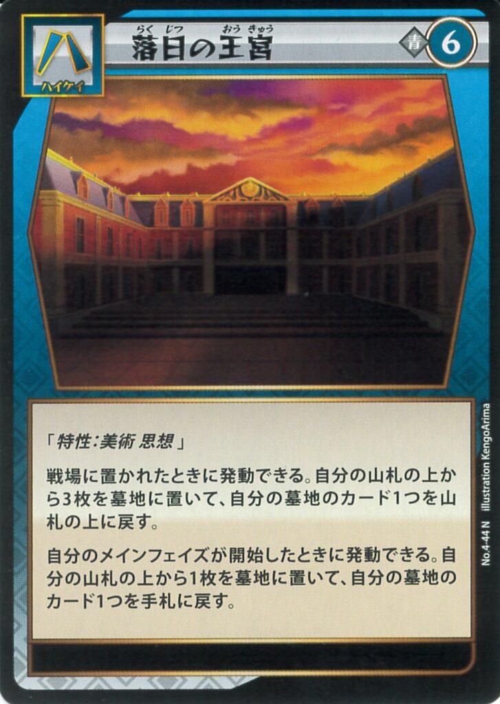 「特性:美術 思想」 戦場に置かれたときに発動できる。自分の山札の上から3枚を墓地に置いて、自分の墓地のカード1つを山札の上に戻す。 自分のメインフェイズが開始したときに発動できる。自分の山札の上から1枚を墓地に置いて、自分の墓地のカード1つを手札に戻す。 | |||||