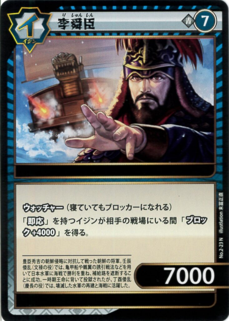 2‐23 李舜臣 2023.12.292024.01.30 色属性レアリティレベルパワー特性青イジンN77000ーテキスト ウォッチャー(寝ていてもブロッカーになれる)「即応」を持つイジンが相手の戦場にいる間「ブロック+4000」を得る。遺業能力ー TIPS 即応を持つイジンが何体いても「ブロック+4000」しか得られない。