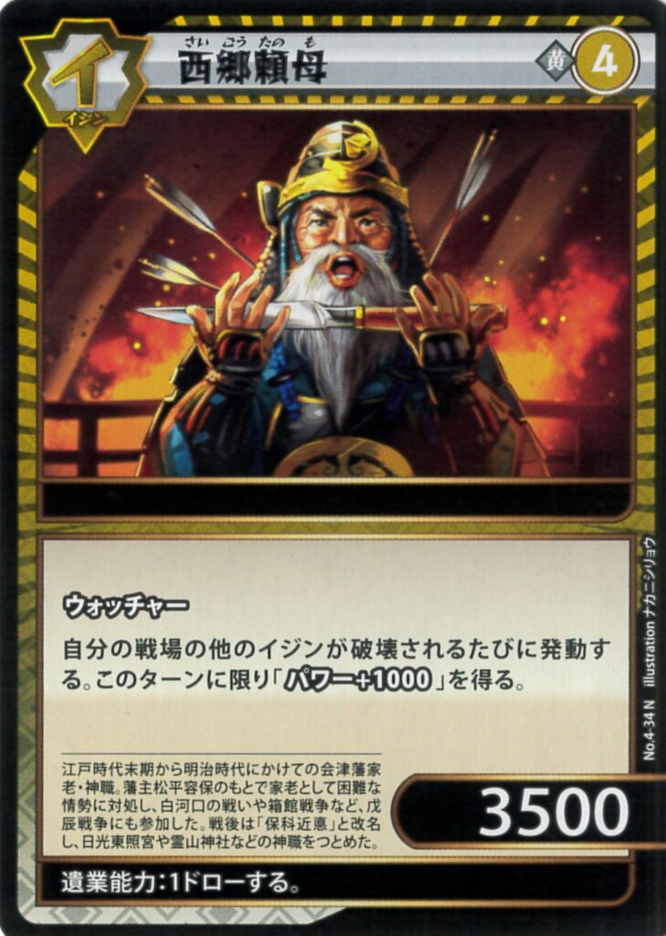 4-34 西郷頼母 2025.01.02 色属性レアリティレベルパワー特性黄イジンN43500ーテキスト ウォッチャー 自分の戦場の他のイジンが破壊されるたびに発動する。このターンに限り「パワー+1000」を得る。遺業能力1ドローする TIPS ブロック時に他のバトルから解決することで高パワーでブロックできるようになるイジン