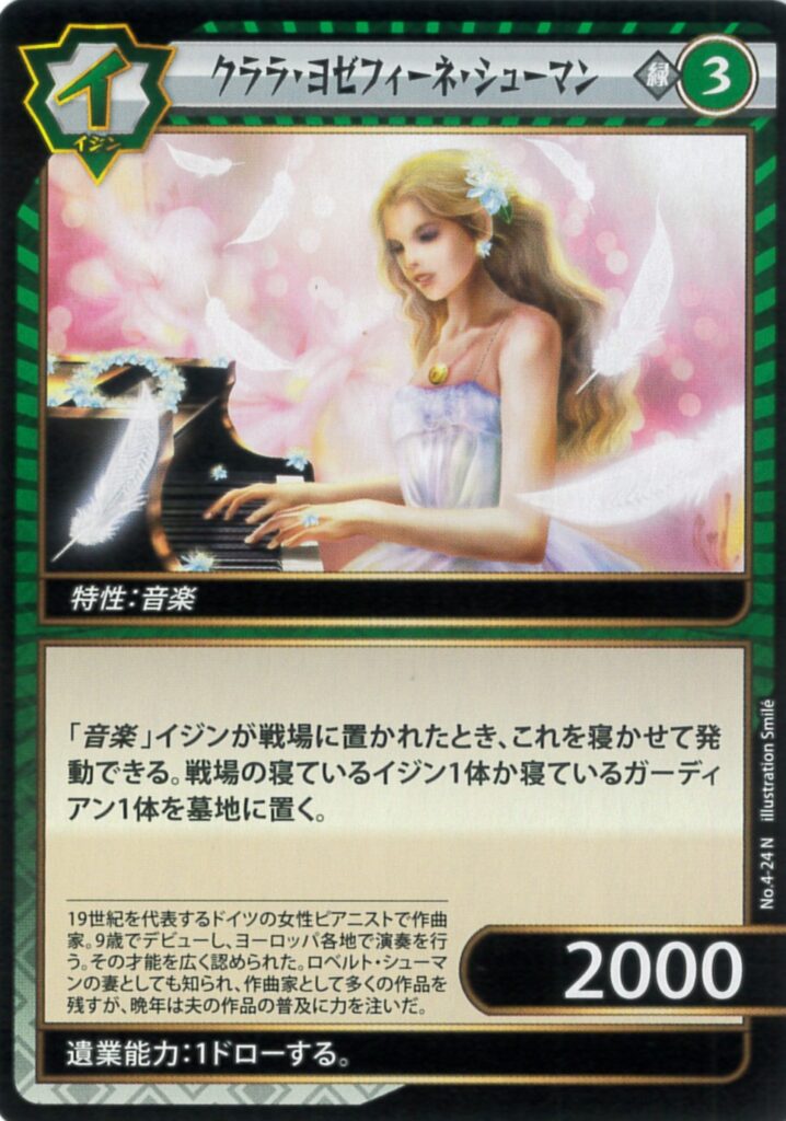4-24 クララ・ヨゼフィーネ・シューマン 2025.01.02 色属性レアリティレベルパワー特性緑イジンN32000音楽テキスト 「音楽」イジンが戦場に置かれたとき、これを寝かせて発動できる。戦場の寝ているイジン1体か寝ているガーディ アン1体を墓地に置く。遺業能力1ドローする TIPS 自分の寝ているイジンやガーディアンを墓地に置くこともできる。