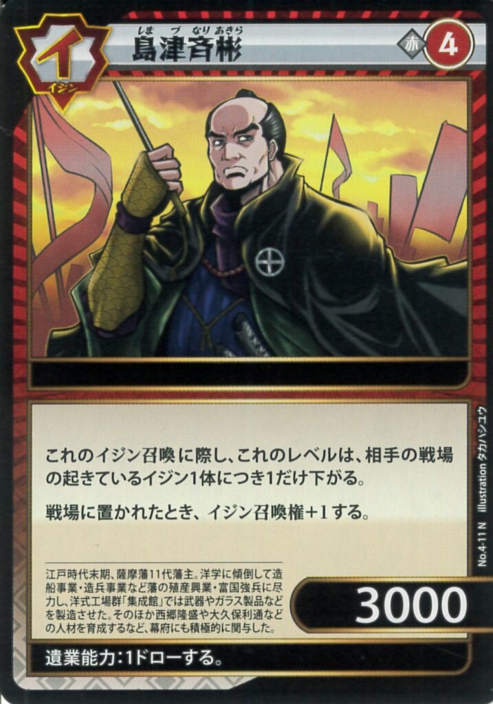 4-11 島津斉彬 2025.01.02 色属性レアリティレベルパワー特性赤イジンN43000ーテキスト これのイジン召喚に際し、これのレベルは、相手の戦場の起きているイジン1体につき1だけ下がる。 戦場に置かれたとき、イジン召喚権+1する。遺業能力1ドローする TIPS イジン召喚までレベルが下がり、戦場に出たらレベル4である。 イジン召喚権は必ず追加しなければならない。