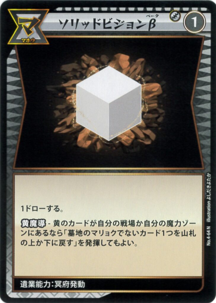 4-64 ソリッドビジョンβ 2025.01.05 色属性レアリティレベルパワー特性無マホウN1(コスト1)ーーテキスト 1ドローする。 黄魔導-黄のカードが自分の戦場か自分の魔力ゾーンにあるなら「墓地のマリョクでないカード1つを山札の上か下に戻す」を発揮してもよい。遺業能力1ドローする TIPS 相手の墓地のカードも戻すことができる。
