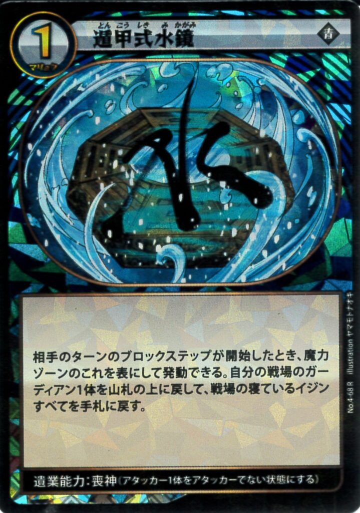 4-68 遁甲式水鏡 2025.01.04 色属性レアリティレベルパワー特性青マリョクR1ーーテキスト 相手のターンのブロックステップが開始したとき、魔力ゾーンのこれを表にして発動できる。自分の戦場のガーディアン1体を山札の上に戻して、戦場の寝ているイジンすべてを手札に戻す。遺業能力喪神(アタッカー1体をアタッカーでない状態にする) TIPS 自分の寝ているイジンも戻ってしまう。 相手が一斉にアタックしてきた場合にすべて手札に戻すことができる、優秀な防御カード。