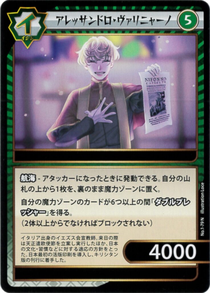 1-79 アレッサンドロ・ヴァリニャーノ 2023.07.232024.01.31 色属性レアリティレベルパワー特性緑イジンN54000ーテキスト 航海-アタッカーになったときに発動できる。自分の山札の上から1枚を、裏のまま魔力ゾーンに置く。自分の魔力ゾーンのカードが6つ以上の間「ダブルプレッシャー」を得る。(2体以上からでなければブロックされない)遺業能力ー TIPS 航海能力は発動しないことも選べる。