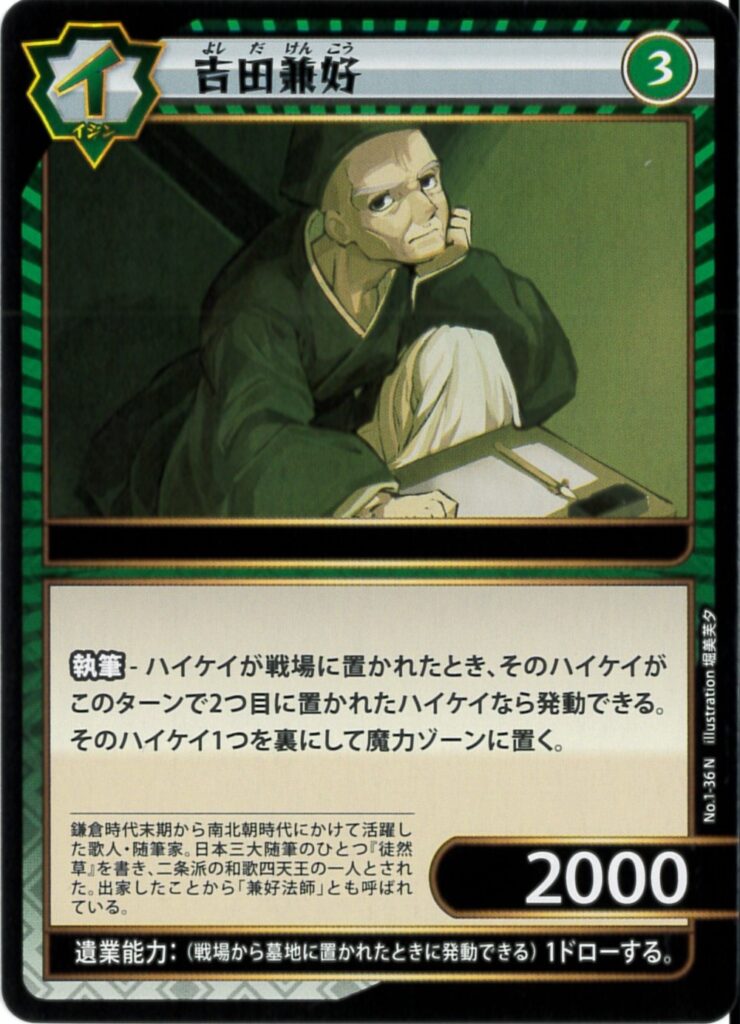 1-36 吉田兼好 2023.07.222024.01.31 色属性レアリティレベルパワー特性緑イジンN32000ーテキスト 執筆-ハイケイが戦場に置かれたとき、そのハイケイがこのターンで2つ目に置かれたハイケイなら発動できる。そのハイケイ1つを裏にして魔力ゾーンに置く。遺業能力1ドローする TIPS 相手のハイケイに対しても発動できる。